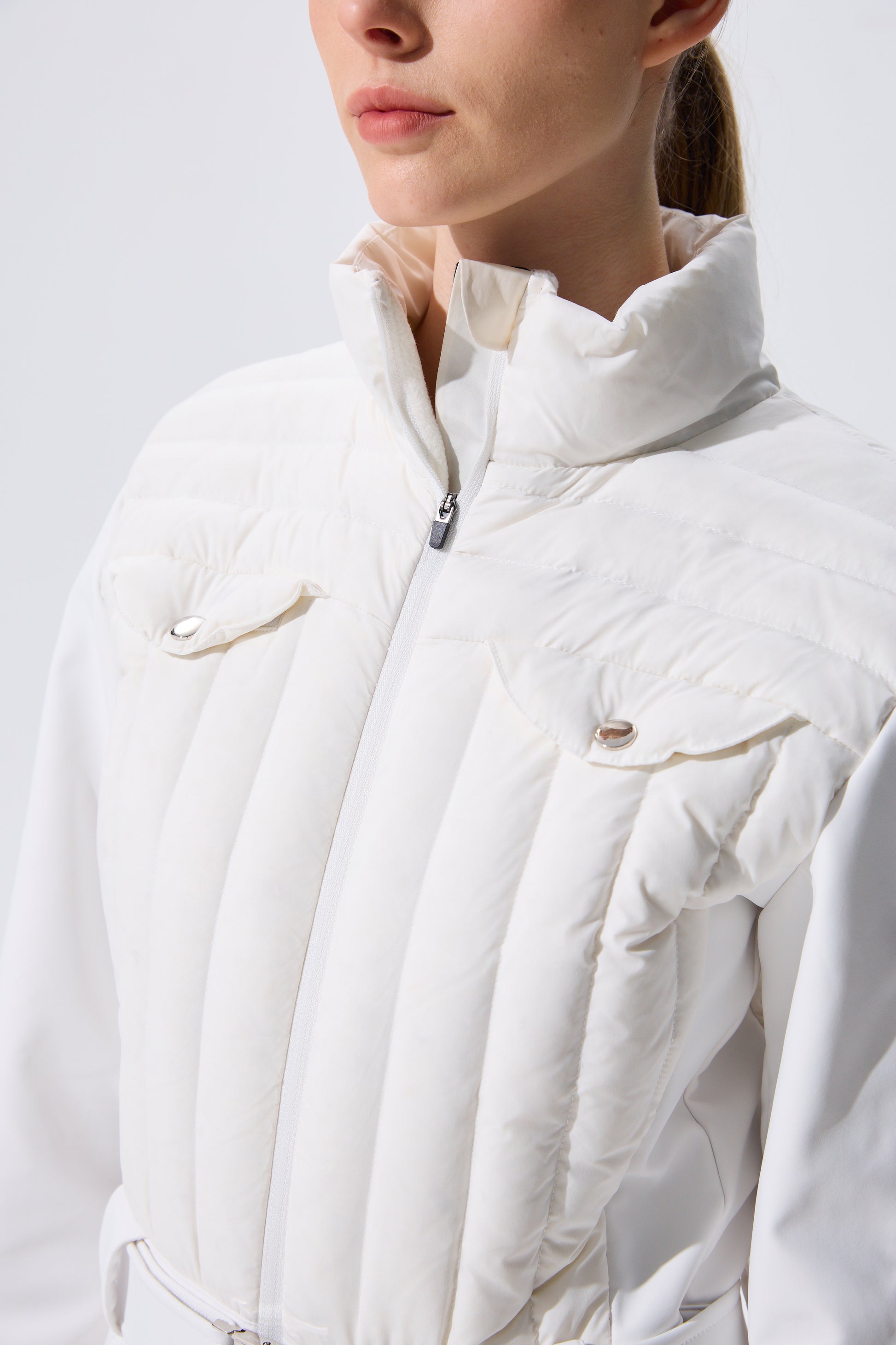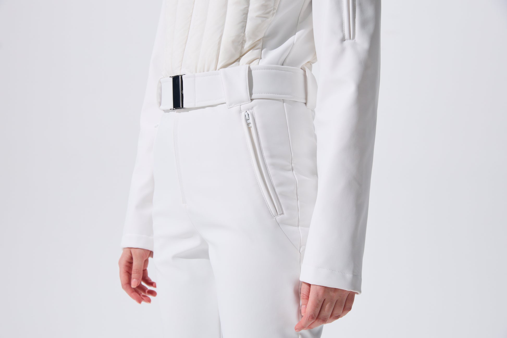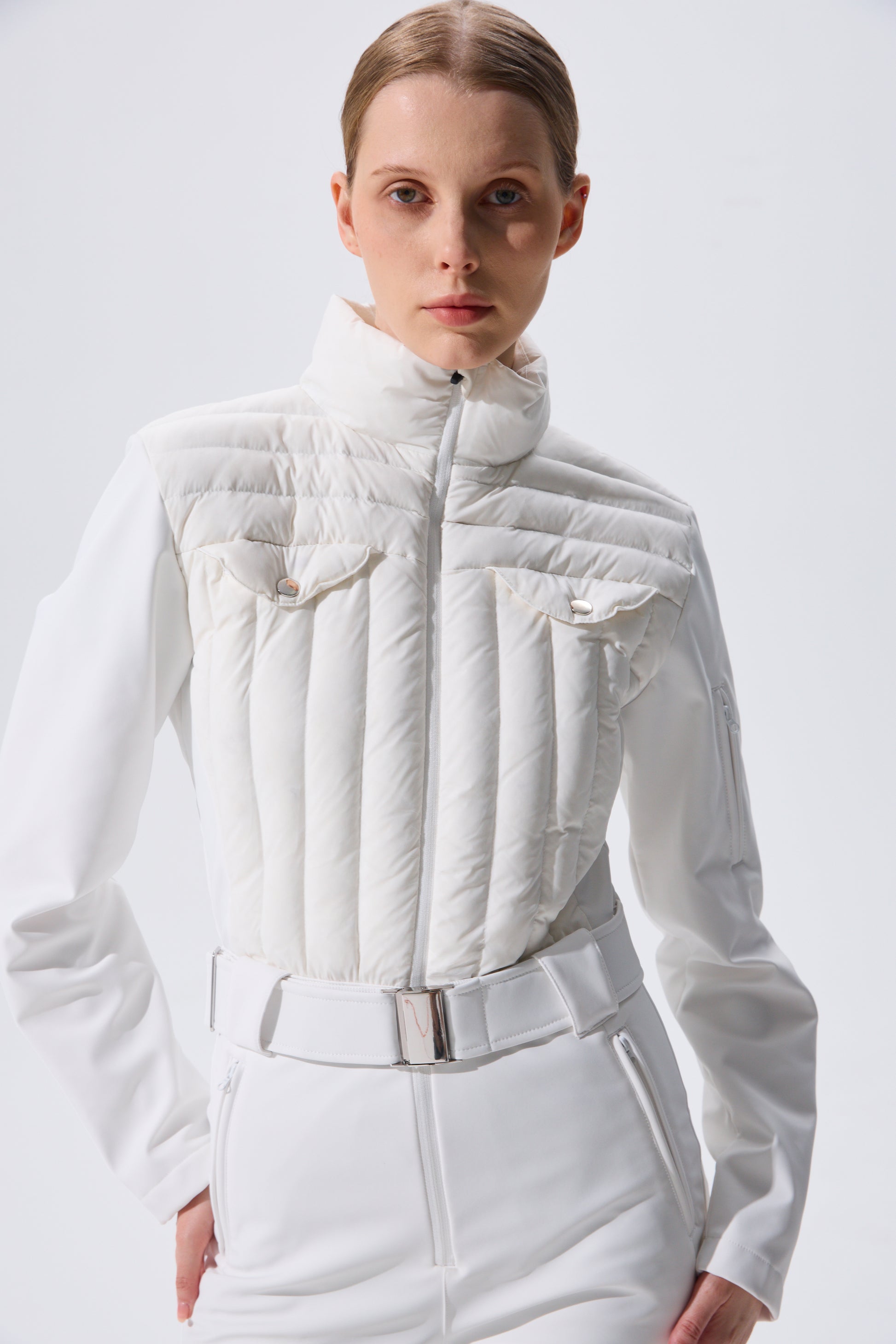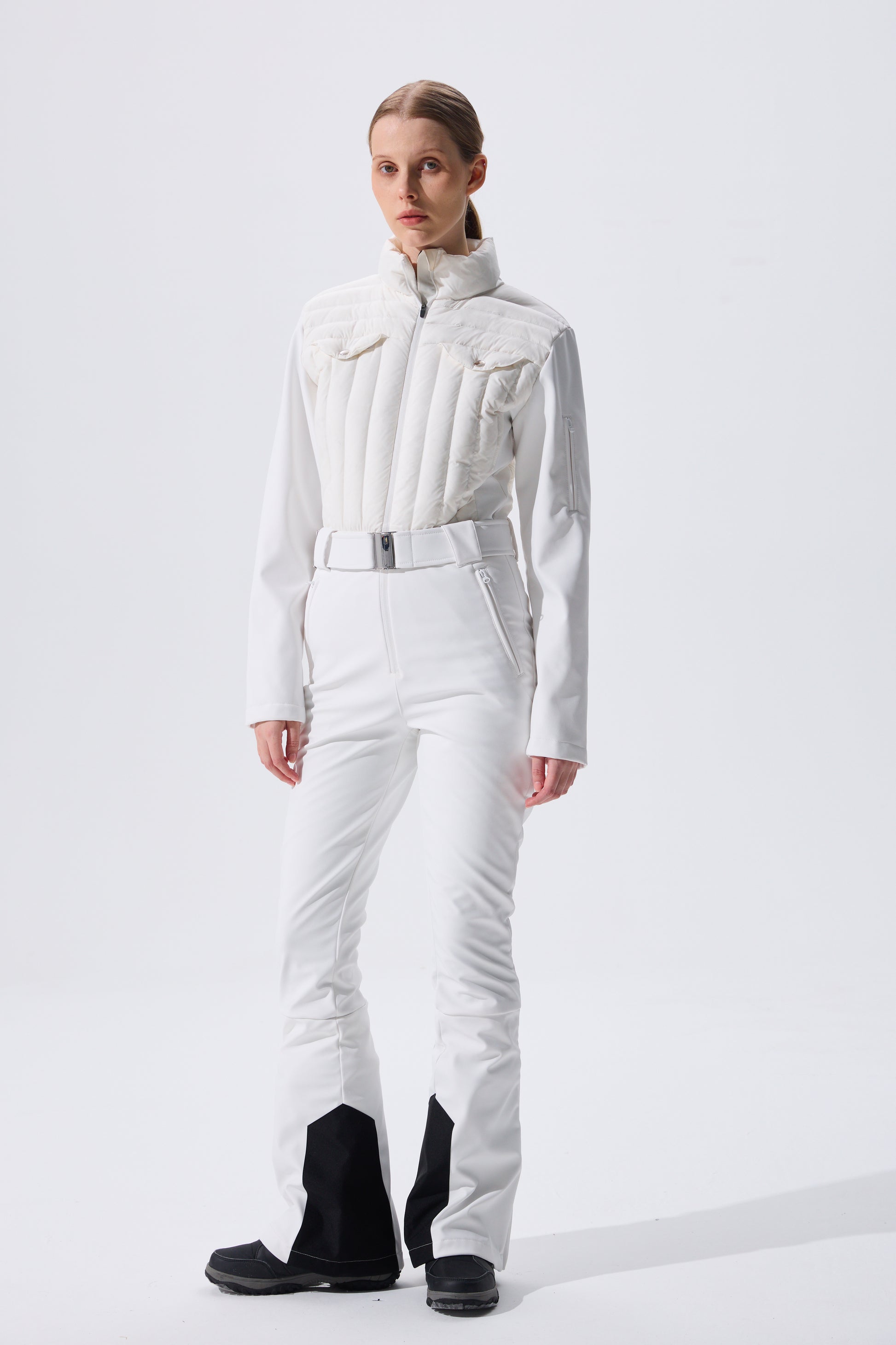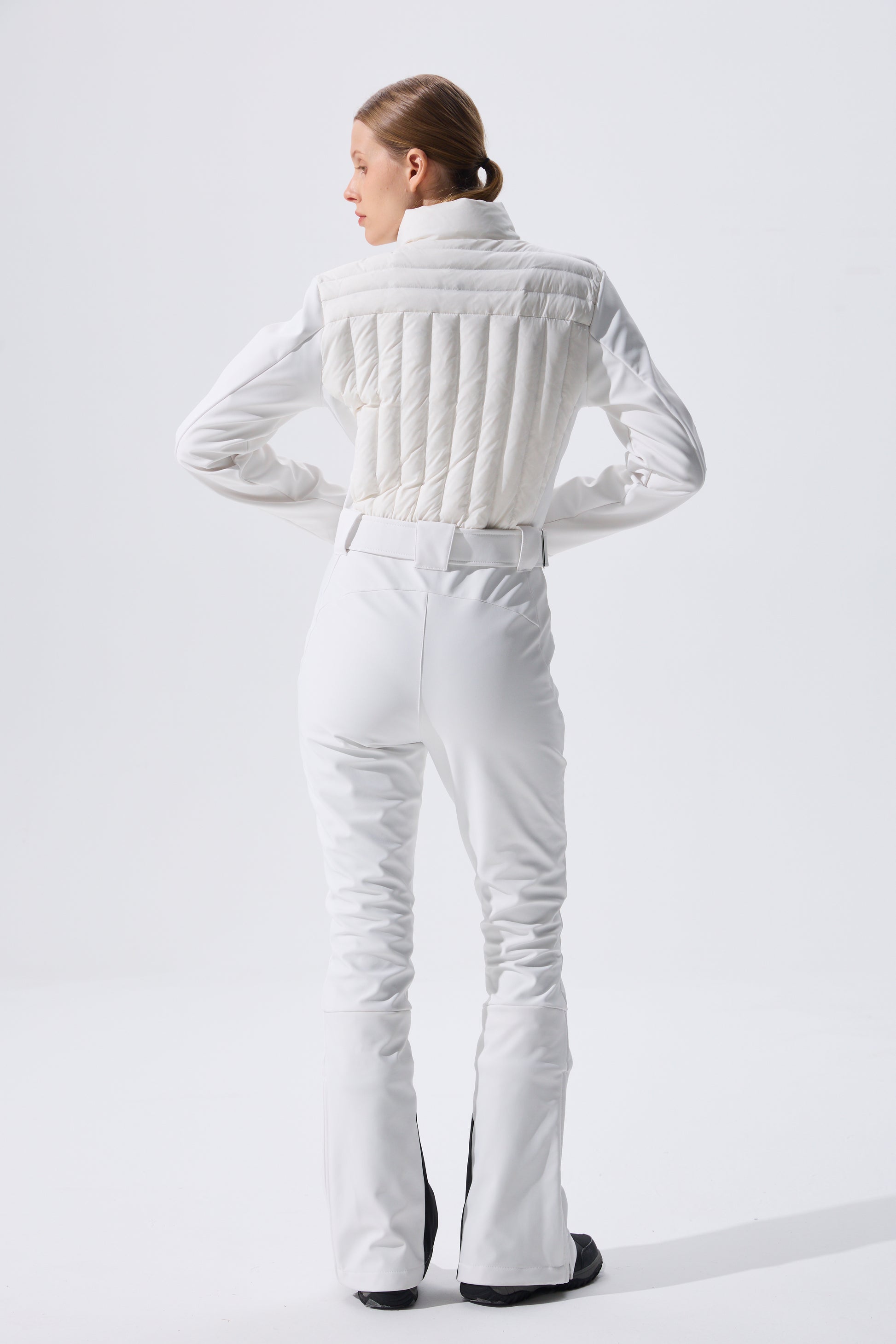 This women's ski jumpsuit features a high-performance stretch softshell fabric. From its classic stand-up collar to the subtle waist tapering, the double-stitched quilted upper body enhances warmth and layering. The three-dimensional cut combines with ergonomic design, while the sleek side lines create a slimming silhouette—transforming functionality into invisible artistry.